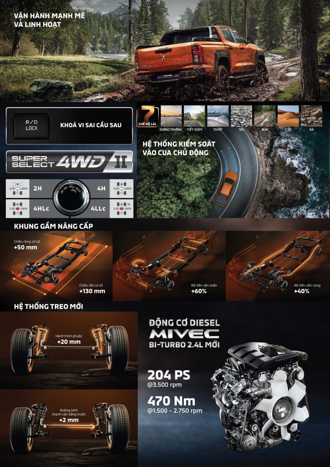 Triton thế hệ mới trang bị động cơ MIVEC 2.4 Bi-Turbo (tăng áp kép) công suất 201 mã lực, mô-men xoắn cực đại 470 Nm. Hộp số tự động 6 cấp. Hệ dẫn động 4 bánh Super Select 4WD-II thế hệ mới với 4 chế độ gài cầu tiêu chuẩn (2H, 4H, 4HLc, 4LLc) và khóa vi sai cầu sau điện tử. Xe có 7 chế độ lái.