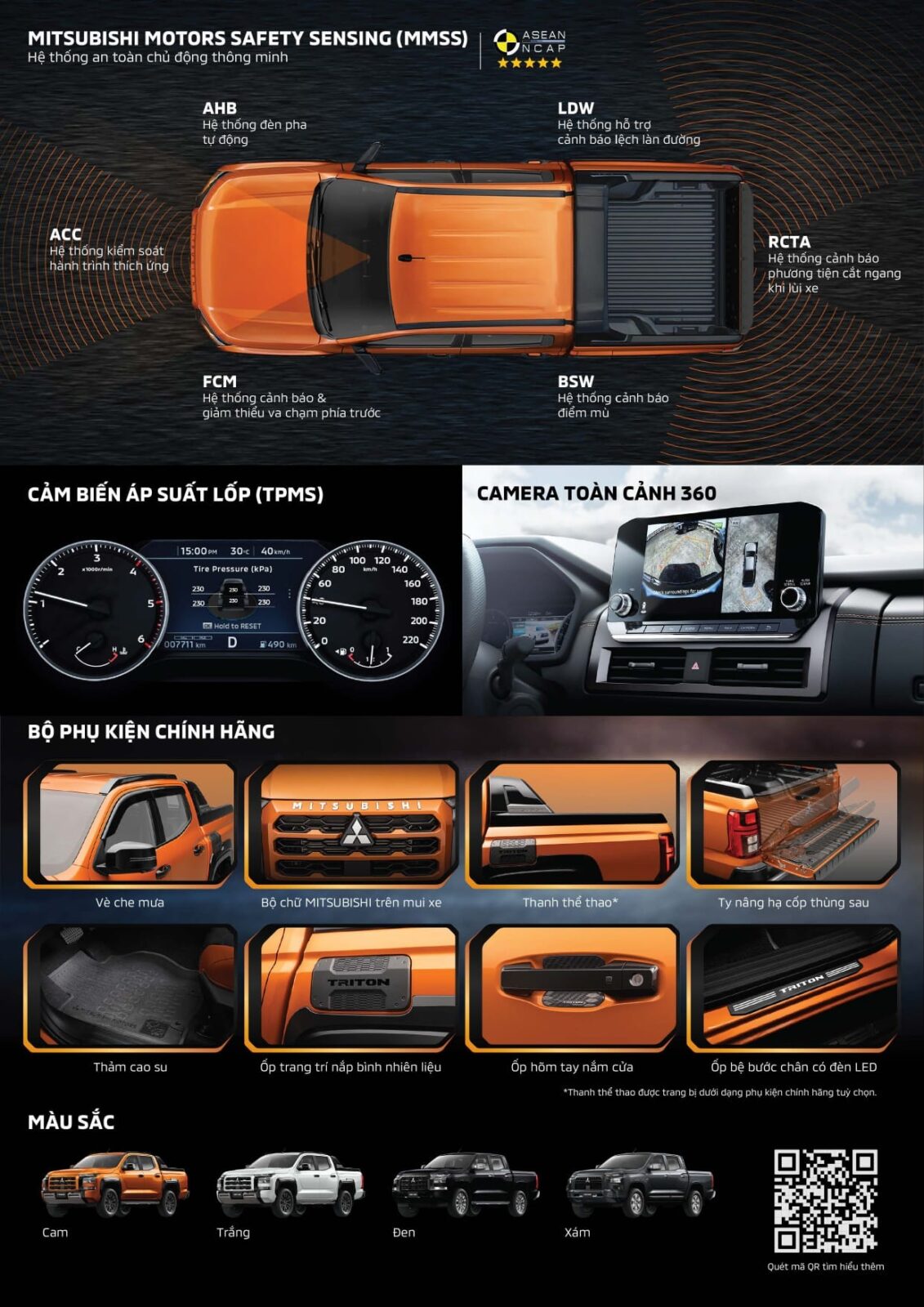 Mẫu bán tải của Mitsubishi nhận 5 sao an toàn từ ASEAN NCAP với loạt trang bị và công nghệ an toàn. Hệ thống an toàn chủ động MMSS (Mitsubishi Motors Safery Sensing) như cảnh báo và giảm thiểu va chạm trước (FCM), kiểm soát hành trình thích ứng (ACC), cảnh báo chệch làn (LDW), đèn pha tự động xa/gần (AHB), cảnh báo điểm mù và hỗ trợ chuyển làn, cảnh báo phương tiện cắt ngang phía sau khi lùi.